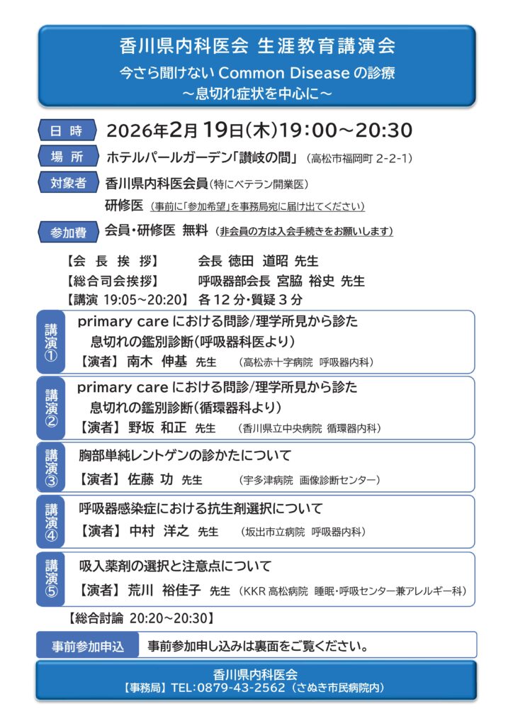 内科医会の教育講演会は、本年2月19日、無事に終了しました。 当日は約40人の会員と、大学の研修医が参加してくれて、約50人程度の盛会になりました。 「胸が苦しい」という主訴から、鑑別すべき疾患や、喘息の吸入薬の指導方法に至るまで「今さら聞けない」をテーマに初心に戻って勉強しました。 登場して頂いた演者の奮闘宜しく、参加された皆さんからは来年度以降も継続を希望する声が聞こえました。