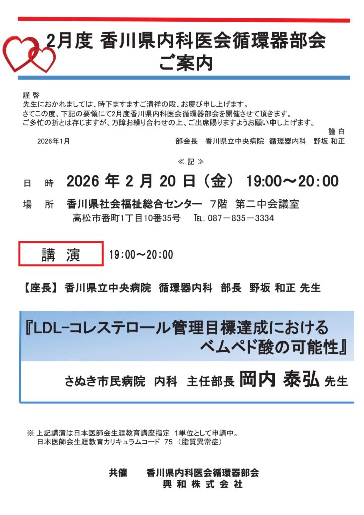 【日時】2026 年 2月20 日 (金)19:00~20:00【場所】香川県社会福祉総合センター7階第二中会議室 高松市番町1丁目10番35号℡. 087-835-3334【講演】『LDL-コレステロール管理目標達成におけるベムペド酸の可能性』【演者】さぬき市民病院 循環器内科主任部長 岡内 泰弘 先生【共催】香川県内科医会 循環器部会・興和株式会社