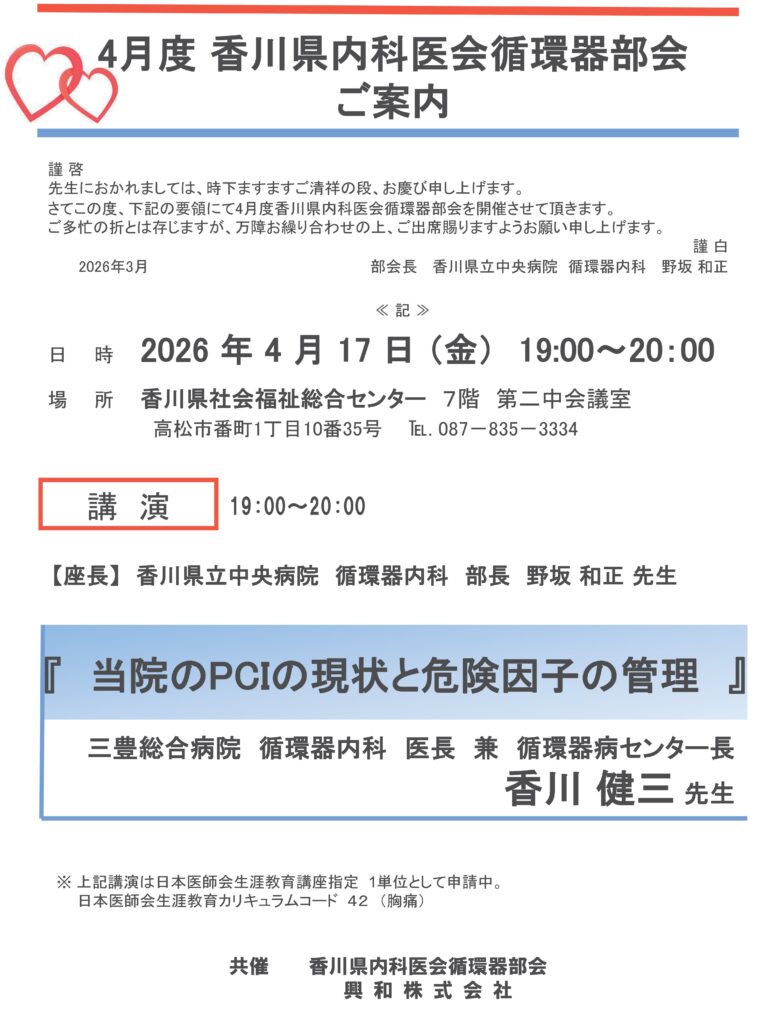 【日時】2026 年 4 月17 日 (金)19:00~20:00【場所】香川県社会福祉総合センター7階第二中会議室 高松市番町1丁目10番35号℡. 087-835-3334【講演】『当院のPCIの現状と危険因子の管理』【演者】香川 健三 先生 三豊総合病院循環器内科医長兼循環器病センター長【共催】香川県内科医会 循環器部会・興和株式会社
