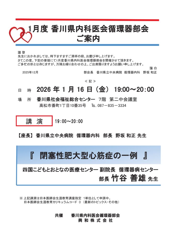 【日時】2026 年 1 月16 日 (金) 19:00~20:00【場所】香川県社会福祉総合センター7階第二中会議室 高松市番町1丁目10番35号℡. 087-835-3334【講演】『閉塞性肥大型心筋症の一例』【演者】竹谷 善雄 先生 四国こどもとおとなの医療センター 副院長 循環器病センター 部長 【共催】香川県内科医会 循環器部会・興和株式会社